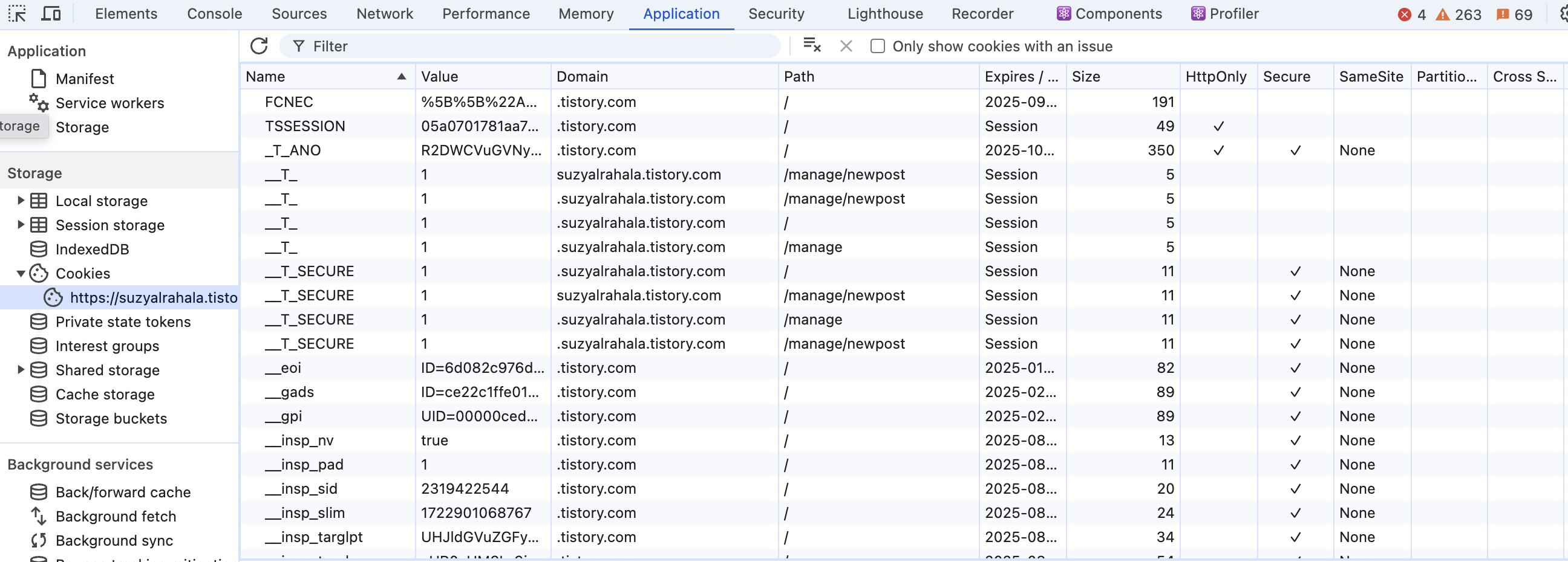 그리고 쿠키에는 다양한 보안 속성이 있습니다. 예를 들어, Secure 속성을 사용하면 HTTPS에서만 쿠키가 전송되고, HTTPOnly 속성을 사용하면 자바스크립트로 쿠키에 접근할 수 없습니다. 이러한 속성들은 보안을 강화하는 데 도움을 줍니다. 개발자 도구의 Application에서 현재 블로그 도메인에 저장된 쿠키의 정보를 확인해보겠습니다.