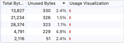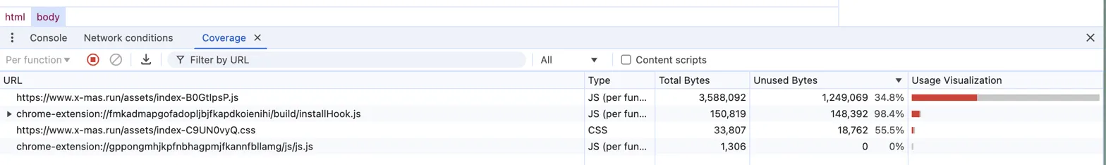 앞서 설명한 세 가지 최적화 작업(청크 분할, 코드 스플리팅, Tree Shaking)을 적용한 결과, 성능이 크게 개선되었습니다. 우선 가장 두드러진 변화는 사용되지 않는 코드의 비율이 35%에서 4.8%로 크게 감소했다는 점입니다. 특히 Three.js와 관련 라이브러리들의 미사용 코드가 대폭 줄어들었죠. 이는 자연스럽게 초기 로딩 성능 개선으로 이어졌습니다.