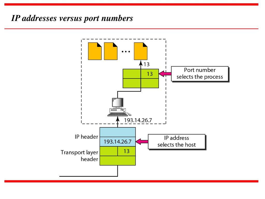 우리는 운영체제의 구멍(포트번호)을 통해서 그 프로그램과 대화를 시도한다. 하나의 컴퓨터 안에 여러 개의 소프트웨어가 있을 것이고, 여기서 운영체제는 어느 소프트웨어로 전송할지를 이 포트 번호(Transport Layer의 주소)를 보고 결정을 하게되는 것이다. TCP/UDP의 포트번호는 16비트로0~65,535안에 존재한다. 웹브라우저가 웹서버 접속할때 80번에 주로 접속하는데, 이처럼 흔히 쓰이게 되는 포트 번호들을 well-known 넘버라고 한다. 0~1023사이의 기본적인 통신체제가 책정되어있다. 게임 소프트웨어들은 포트 번호 공개하는 경우들이 있는데 이는 바로 충돌을 피할 수 있도록 "우리가 이 번호를 사용하고 있으니 웬만하면 사용하지 마세요"라고 알려주는 것이다.