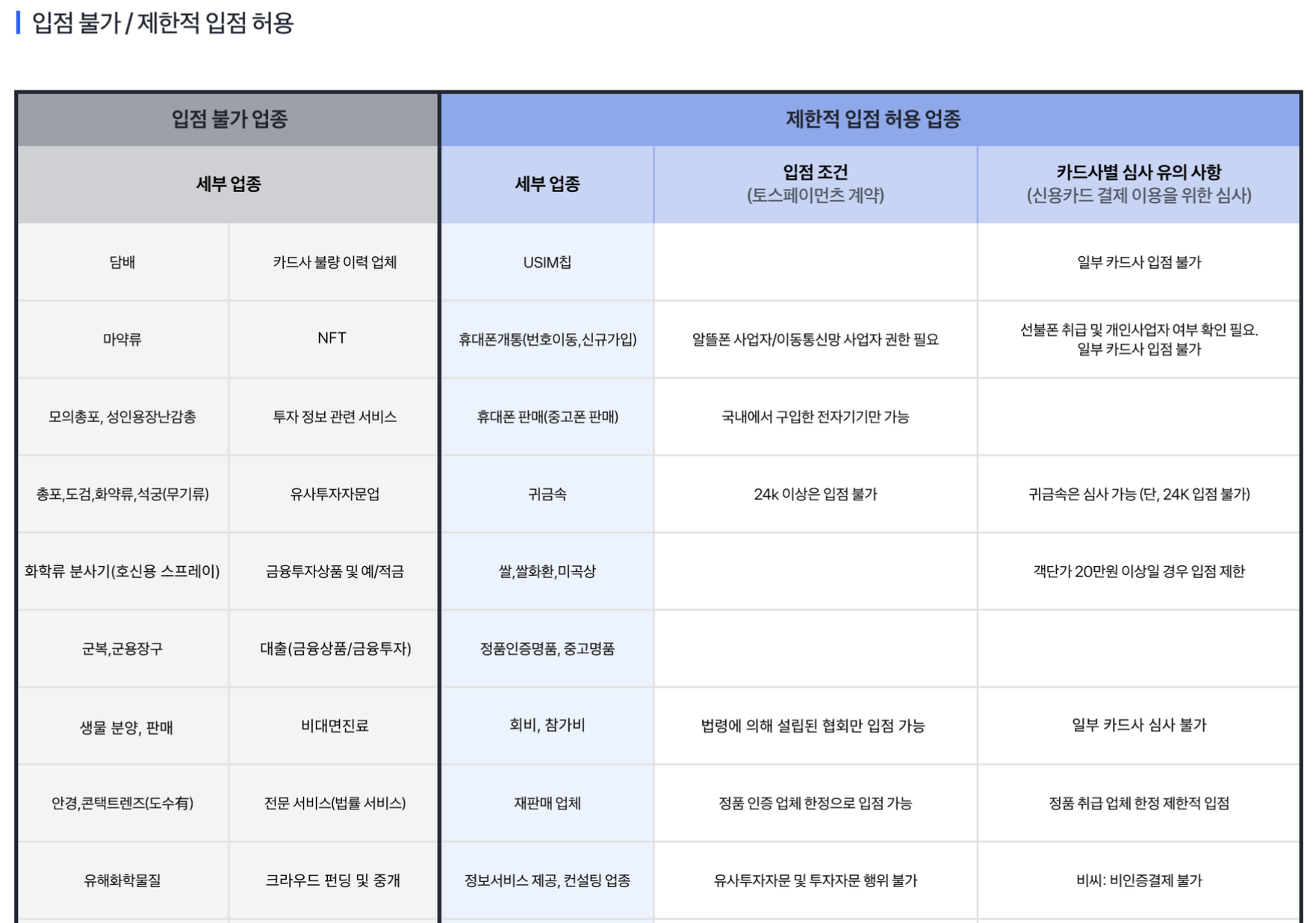 창업은 처음이라 그냥 결제 시스템은 개발만하면 된다 생각했지, 이렇게 가맹이 불가능한 업종의 종류들이 있을지는 생각도 못했다. 기존의 펀딩 관련된 업체, 와디즈, 텀블벅도 이미 존재했고, 비슷한 선물 펀딩 사이트들도 있었기에 결제에서 심사가 거절될 것이라고는 생각도 하지 못했다. 이번 기회를 통해서 알게된 건, 일단 사업을 시작하기로 했을 때, 그 사업이 결제를 붙일 수 있는 서비스인지를 먼저 파악해야한다는 것이다. 펀딩도, 안경도, 채팅도, 선결제, 포인트도 입점이 안되는 업종일지는 정말 생각도 못했다. 이미 그런 업체들이 있기에 더욱 생각하기 어려웠던 것 같다.