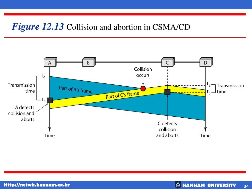 말그대로 캐리어라는 전자적 신호를 감지하는 것이다. 예를 들어 하나의 유선에서 n명이 통신을 한다. 이때 transmission이 동시에 발생하면 collision, 충돌이 발생한다. 이렇게 동시 전송이 발생시켜져버려 아무도 통신하지 못하게 되는 것을 탐지하고 알려주고 회피시킨다. transmission이 성공하면 끝. 이더넷, 초고속 인터넷, 광랜이 있다.